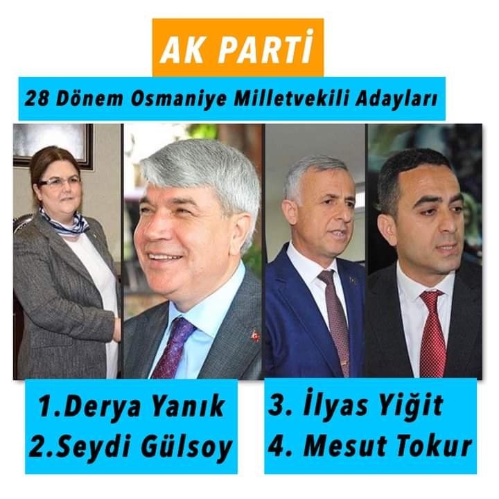AK PARTİ OSMANİYE MİLLETVEKİLİ ADAYLARI kadirligazetesi 3 yıl önce 1.Derya Yanık 2.Seydi Gülsoy 3. İlyas Yiğit 4. Mesut Tokur