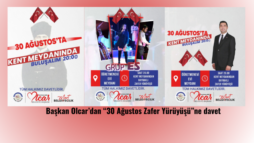 30 Ağustos Zafer Bayramını büyük bir coşkuyla kutlamak için hazırlıklarını tamamladıklarını belirten Belediye Başkanı Mustafa Mert Olcar, “30 Ağustos Zafer Bayramımızda bayraklarla ve meşalelerle yürüyüp, Grup Es konseri ile Zafer Bayramı coşkusunu hep birlikte yaşayacağız. 30 Ağustos Cuma günü saat 20.00’da Kent Meydanı’nda bayraklı zafer yürüyüşümüz başlayacak ve Atatürk Caddesi üzerinden Öğretmenevi önündeki konser alanına doğru hep birlikte yürüyeceğiz. Sonrasında Grup Es ile bizleri muhteşem bir konser bekliyor olacak. Tüm hemşehrilerimizi hep birlikte zafer coşkumuzu yaşamaya davet ediyorum. Bu gurur dolu günde bir arada olalım. Başta Gazi Mustafa Kemal Atatürk olmak üzere, Kurtuluş Savaşı’nın tüm kahramanlarını bir kez daha rahmetle anıyor, aziz hatıraları önünde saygıyla eğiliyorum. 30 Ağustos Zafer Bayramı’mız kutlu olsun” dedi.