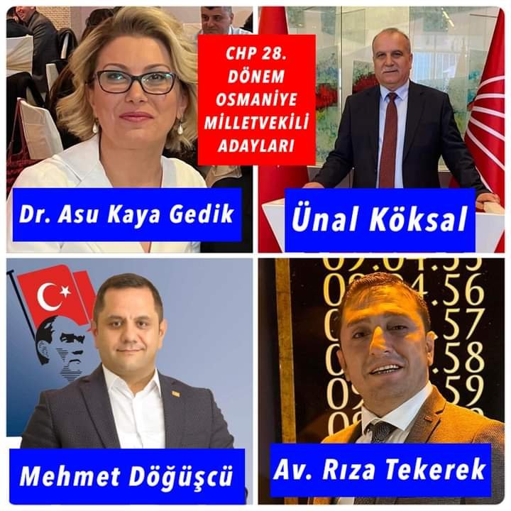 CHP 28. Dönem Osmaniye Milletvekili Listesi açıklandı kadirligazetesi 3 yıl önce 1.Dr. Asu K.aya Gedik 2.Ünal Köksal 3. Mehmet Orhun Döğüşcü 4. Rıza Tekerek