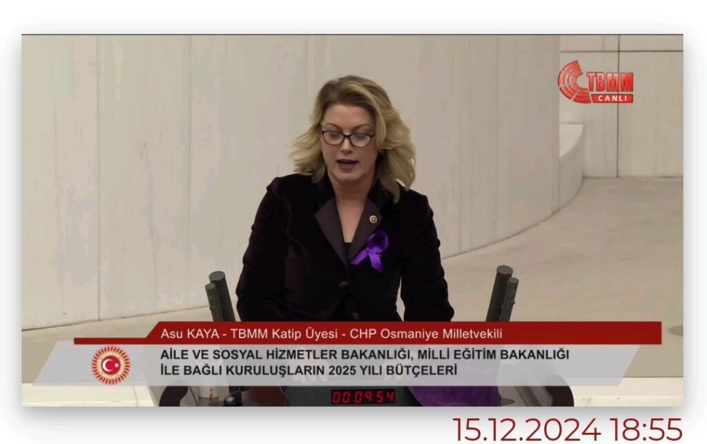 (TBMM) – CHP Osmaniye Milletvekili Asu Kaya, Aile ve Sosyal Hizmetler Bakanlığı’nın bütçe görüşmelerinde; “Katledilen kadınları yaşatamayan bir anlayışın, cezasızlığı kural haline getirenlerin, fail erkekleri cesaretlendirenlerin hazırladıkları bütçeyi reddediyoruz. Çare, kurumları kavga ederken sizi yok sayan, size sırtını dönen bir anlayışta değil. Çare vatandaşlarına, kadınlara hizmet edecek bir devlet anlayışını yeniden ayağa kaldıracak olan Cumhuriyet Halk Partisi’ndedir” dedi.TBMM Genel Kurulu’nda Aile ve Sosyal Hizmetler Bakanlığı ile Milli Eğitim Bakanlığı’nın 2025 yılı bütçelerinin görüşmeleri devam ediyor. Genel Kurul’da CHP’li milletvekilleri yakalarına mor kurdele takarak, “Kadın cinayetleri sanal değil gerçekliktir”, “6284’ü etkin uygula”, “İstanbul Sözleşmesi yaşatır” yazılı dövizlerle kadın cinayetlerini protesto etti. CHP’li vekiller cinayete kurban giden Narin, Şirin Elmas, Ayşenur Halil, İkbal Uzuner, Ayşe Dürüst ve Eylem Sevilen’in fotoğraflarını da taşıdı. CHP Osmaniye Milletvekili Asu Kaya, “Düzeniniz çocukları ve kadınları öldürüyor” yazılı dövizle kürsüye çıktı. Asu Kaya’nın açıklamasından öne çıkanlar şöyle:”22 yıllık iktidarınızın sonunda, kadınlar ve çocuklar için daha adil ve eşit bir bütçe teklif etmeniz gerekirken, tüm kırılgan grupları karşı karşıya bıraktığınız bir adaletsizliği, ayrımcılığı, umutsuzluğu ve derin yoksulluğu ortaya çıkaran bir bütçeyi konuşuyoruz bugün. Kadınların, çocukların geleceksizliğini konuşuyoruz bugün. Aslında biz değil, ülkemizin her yerinde, iktidarınızın yarattığı ağır buhranın yükünü her zaman olduğu gibi taşıyan her yaştan kadınlar konuşuyor bugün. Antalya Döşemealtı’nda, bir nar deposunda gece gündüz demeden çalışan ve ’20 yılda bizi bitirdiler’ diye isyan eden Elif abla konuşuyor bugün. Mersin Yenişehir pazarında karşılaştığımız ve ‘Millet aç, açlığın tarifi var mı? Kadınlar evlerine yiyecek götüremiyor, kadınlar dibi gördü’ diye isyan ettirdiğiniz Gül konuşuyor bugün. Depremin üzerinden geçen 2 sene sonrasında bile hala önünü göremeyen, kendisinden habersiz dükkânı rezerv alan olan Osmaniyeli depremzede kadın esnaf Ayşe kardeşim konuşuyor bugün. Değer değil hak isteyen bu kadınların bugüne kadar sizin insafınıza kaldığını düşünüyordunuz. Oysa ki çökerttiği devlet sisteminin bütün yükünü kadınlara taşıtan iktidarınız, size isyan eden tüm kadınlardan sandıkta cevabını aldı, bir sonraki seçimde bu cevap daha ağır olacak. Az kaldı, bekleyin.