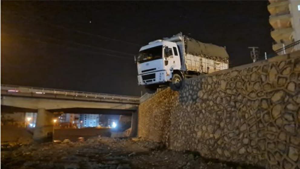 Kadirli ilçesinde kontrolden çıkan odun yüklü kamyon istinat duvarında asılı kaldı. Araç içinde kimseye rastlamayan ekipler sürücüye ulaşmak için çalışma başlattı