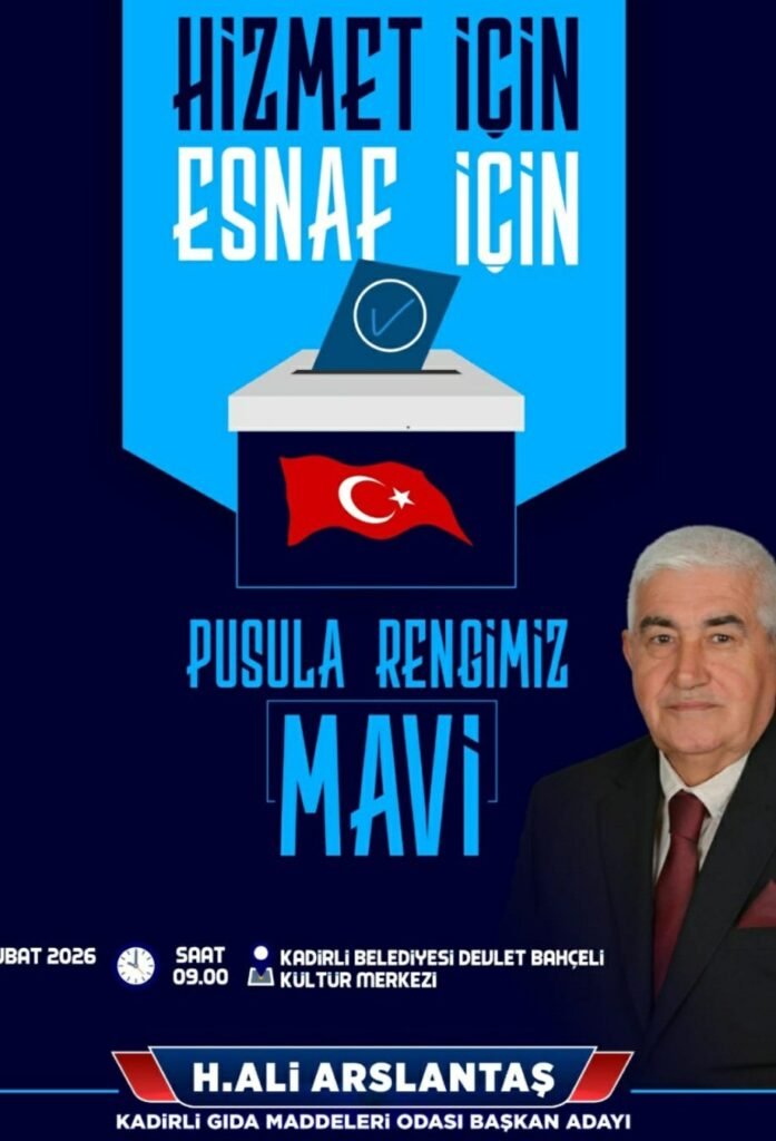 Kadirli Gıda Maddeleri Esnaf Odası Başkan Adayı H. Ali Arslantaş 17 Şubat’ta yapılacak Oda Başkanlığı seçimine üyeleri davet ederek Güçlü Oda Güçlü Esnaf için Mavi Liste ile seçime girdiklerini ve üyelerin desteğini beklediğini belirtti.