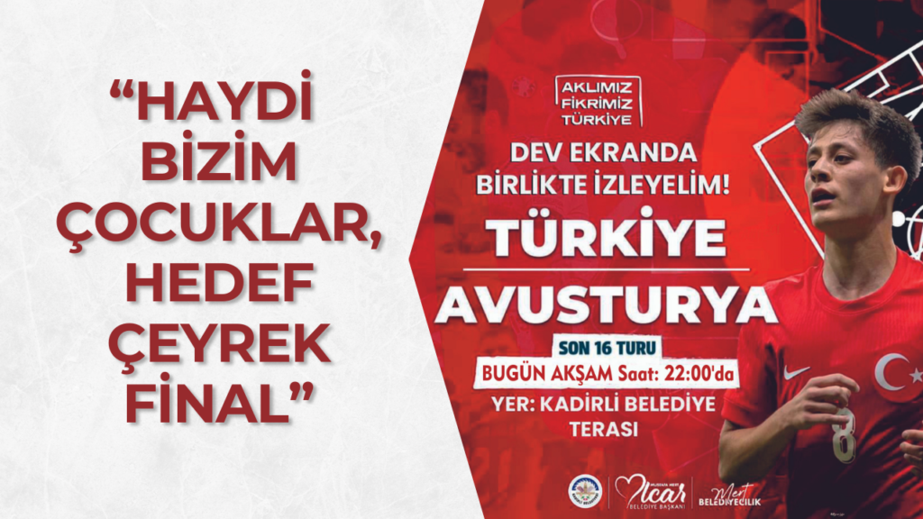 Kadirli Belediye Başkanı Mustafa Mert Olcar, A Milli Takımımızın, bu akşam EURO2024’te Avusturya’ya karşı oynayacağı son 16 turu mücadelesini dev ekranda birlikte izlemeye davet etti.