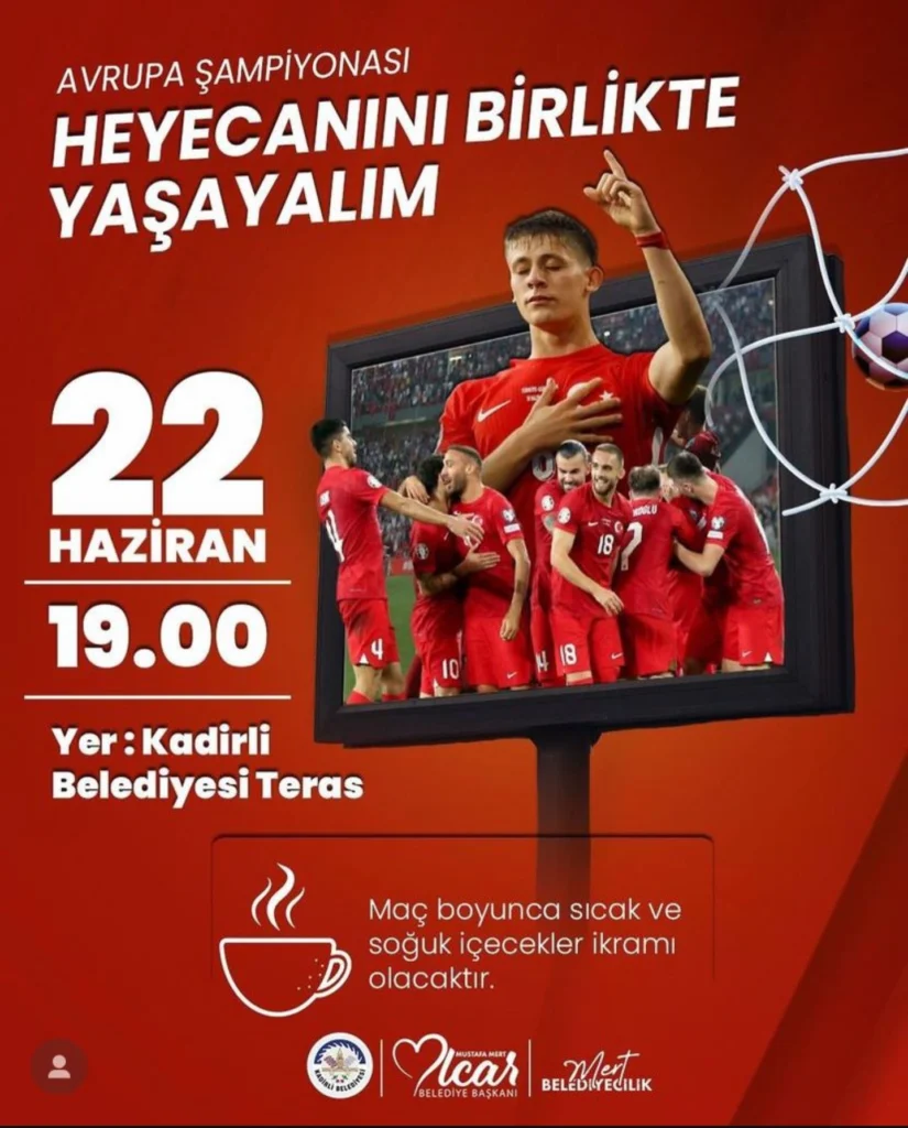 Milli maç için Cumartesi günü saat 19.00’da Kadirli Belediyesi hizmet binası teras bölümünde ekran kuracaklarını belirten Kadirli Belediye Başkanı Mustafa Mert Olcar, “Bizim Çocukların EURO 2024 heyecanını birlikte yaşıyoruz. A Milli Futbol Takımımızın 22 Haziran Cumartesi günü saat 19.00’da Portekiz ile oynayacağı 2024 Avrupa Şampiyonası maçını, belediyemiz teras bölümünde kuracağımız dev ekranda hep birlikte izleyeceğiz.” diyerek, tüm vatandaşları bu heyecana ortak olmaya davet etti.