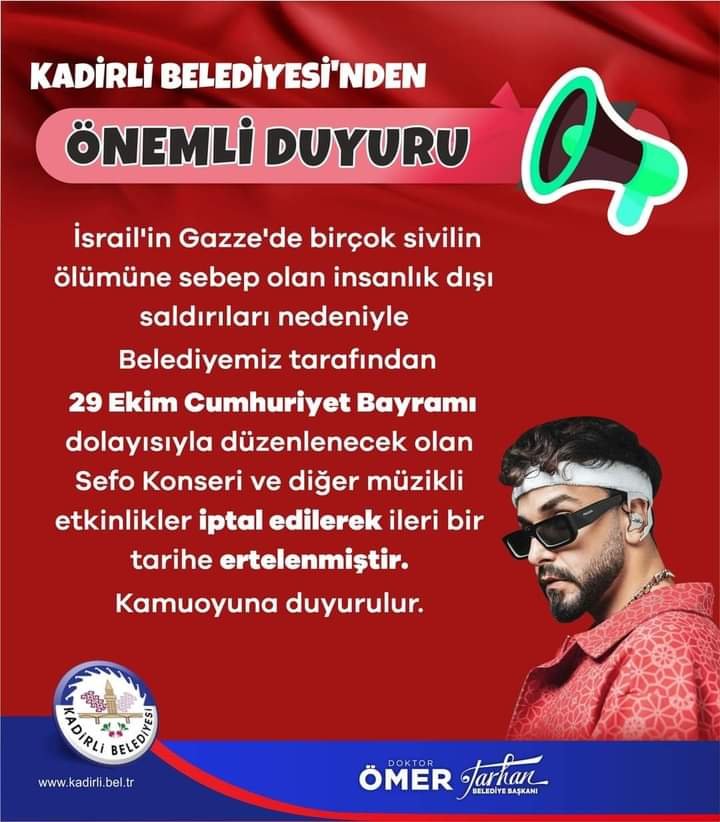 İsrail’in Gazze’de birçok sivilin ölümüne sebep olan insanlık dışı saldırıları nedeniyle Kadirli Belediyesi tarafından 29 Ekim Cumhuriyet Bayramı dolayısıyla düzenlenecek olan Sefo Konseri ve diğer müzikli etkinlikler iptal edilerek ileri bir tarihe ertelenmiştir. Kamuoyuna duyurulur.
