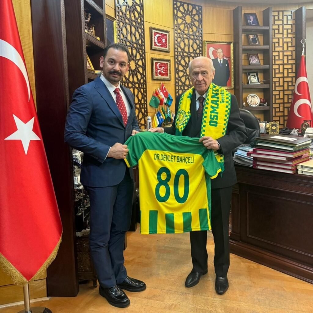 Osmaniyespor Kulübü Başkanı Mahmut Altay Kobaner, MHP Genel Başkanı Devlet Bahçeli’yi makamında ziyaret etti. Bahçeli’ye kulübün ‘Onursal Başkanlık Belgesi’ni takdim eden Kobaner, takımın forma ve atkısını da hediye etti. Osmaniyespor formasını giyen Bahçeli, hatıra fotoğrafı çektirdi.