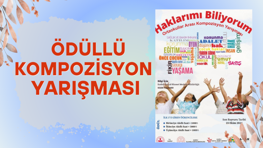 Kadirli Kaymakamlığı Koordinesinde Kadirli Sosyal Hizmet Merkezi Müdürlüğü, Kadirli İlçe Milli Eğitim Müdürlüğü ve Kadirli Eğitim ve Kültür Vakfı işbirliği ile yürütülen “Çocuk Haklı” projesi kapsamında ilçemiz ortaokulları arası Çocuk Hakları konulu ödüllü kompozisyon yarışması düzenlenecektir. Yarışmada dereceye giren öğrencilerden