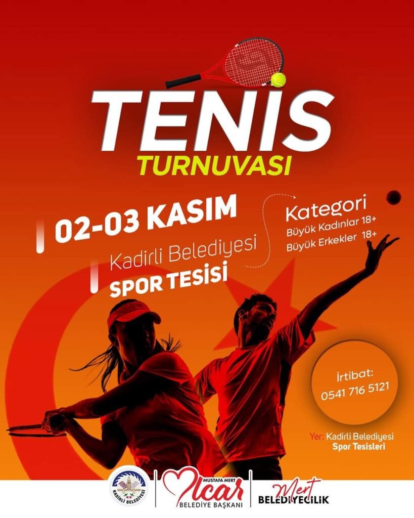 Kadirli Belediyesi tarafından Büyük Kadınlar & Büyük Erkekler kategorilerinde ödüllü tenis turnuvası düzenlenecek.Kadirli Belediyesi sosyal medya hesabından yapılan açıklamada, Cemalpaşa Mahallesi Kadirli Belediyesi Spor Tesislerinde 2 Kasım Cumartesi ve 3 Kasım Pazar günü yapılacak 18 yaş üzeri Büyük Kadınlar & Büyük Erkekler ödüllü tenis turnuvasına katılmak isteyenlerin ☎ Katılım için irtibat: 0541 716 5121 nolu telefonu arayabilecekleri belirtildi.