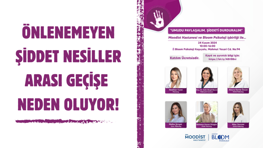 Moodist Hastanesi ve Bloom Psikoloji Koordinatörü Psikolog Neslihan Turan, Psikiyatri Uzmanı Doç. Dr. Selin Birgül Baran, Klinik Psikolog Aleyna Damla Özcan, Uzm. Psikolog Melike Şimşek, Klinik Psikolog Semanur Konuk Düzgün ve Klinik Psikolog Nilsu Yavuzver’in değerli bilgiler ile yer alacağı etkinlik, 24Kasım Pazar Günü, 6 farklı oturumda sunulacak.