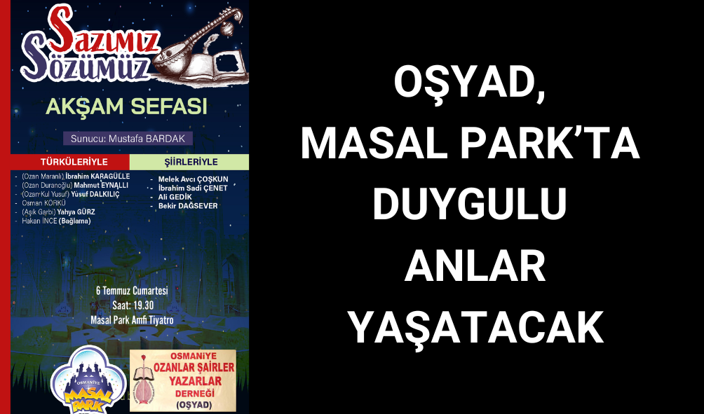 Osmaniye Ozanlar, Şairler ve Yazarlar Derneği (OŞYAD), Masal Park’ta türkü ve şiir etkinlikleri düzenleyecek.