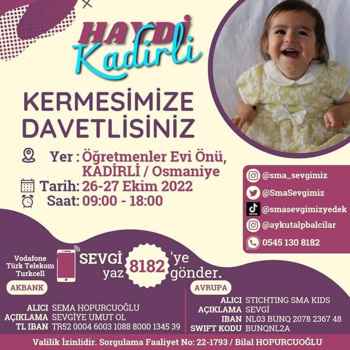 SMA Hastası Sevgi Bebek için 26-27 Ekim tarihlerinde öğretmen evi önünde kermes açılacaktır.Tüm Kadirliler kermese gelerek Sevgi Bebeğe destek olabilirler.