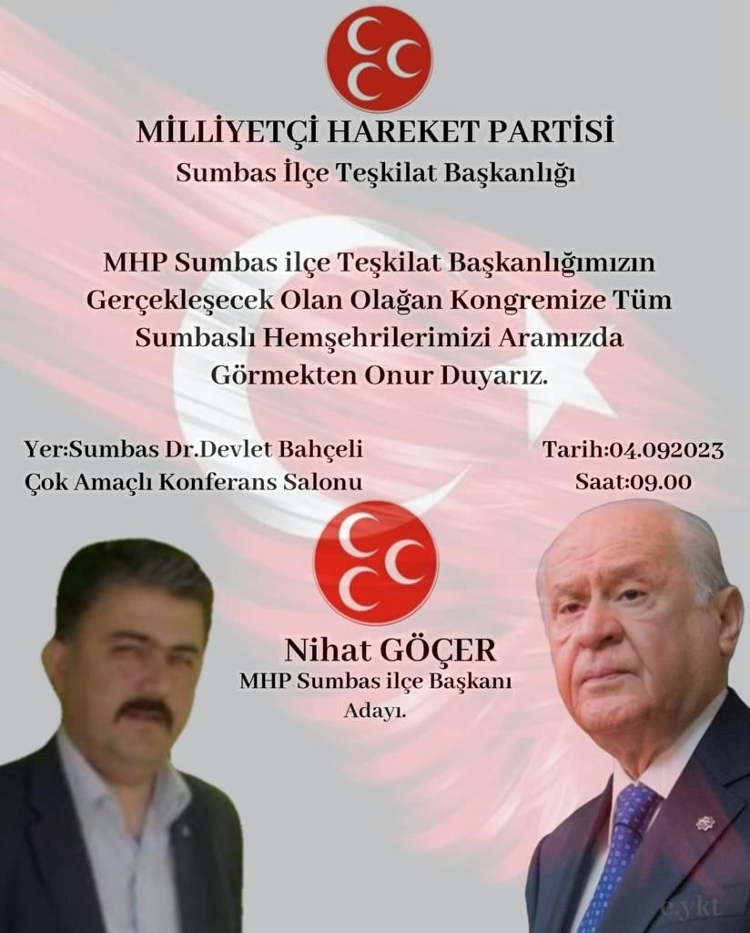MHP Genel merkezinin kongrenin tek liste halinde yapılması yönünde görüş bildirdiği ve seçimlere bir aday ile gidileceği konusu gündeme gelmesiyle birlikte Osmaniye’nin tüm ilçelerinde kongreler tek liste halinde kongreye gidiliyor. MHP Osmaniye İl Başkanlığı tarafından, MHP Genel merkezinin talimatları doğrultusunda yapılan isim belirleme çalışmalarında, yarın yapılacak olan Sumbas İlçe Başkanlığı kongresinde Nihat Göçer ile birlikte tek liste halinde gidilecek.Milliyetçi Hareket Partisi Sumbas İlçe Teşkilatı 14.Olağan Kongresi 04.09.2023 tarihinde Pazartesi günü Saat 09.00’da Sumbas Dr. Devlet Bahçeli Çok Amaçlı Konferans Salonunda yapılacak.