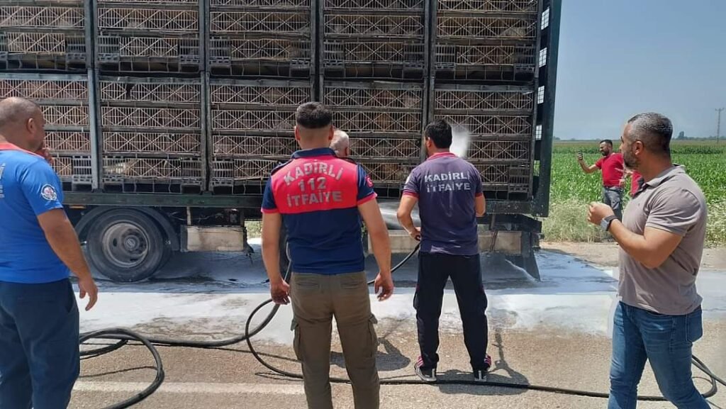 Kadirli-Sumbas karayolunda henüz öğrenilemeyen bir nedenle canlı tavuk taşıyan kamyonun dorse kısmında yangın çıktı.. Belediye itfaiye ekiplerince müdahale edilen yangın söndürüldü..