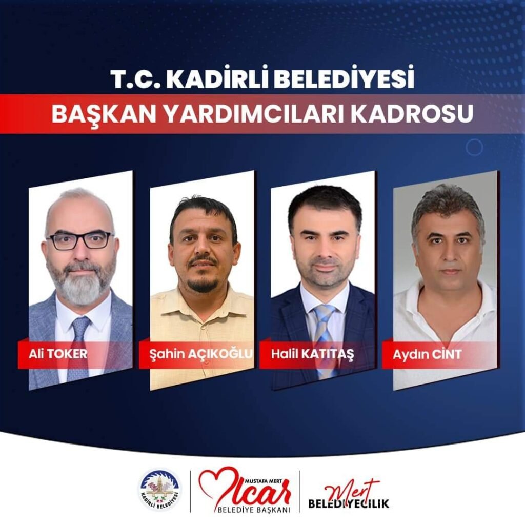 T.C. Kadirli Belediyesi Başkan Yardımcılarımız! kadirligazetesi 2 yıl önce 🤝 Başkan Yardımcılarımız:✨ Ali Toker✨ Şahin Açıkoğlu✨ Halil Katıtaş✨ Aydın Cint Geleceği birlikte şekillendiriyoruz!