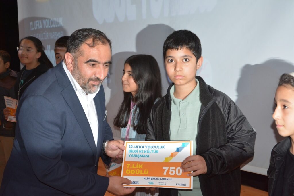 Kadirli İlçe Müftüsü Yakup Etik, Sumbas İlçe Müftüsü İbrahim Akyüz, Orman İşletme Müdürü Adem Sarıbıyık, İlçe Sağlık Müdürü Mustafa Ozan Özkale, İlçe Milli Eğitim Müdürü İlyas Tapsız, Akparti İlçe Başkanı H. Mustafa Gök, Sivil toplum kuruluşlarının başkanları, Muhtarlar ve vatandaşların katıldığı ödül töreninde İlkokul Ortaokul Lise ve yetişkin kategorilerinde ilçemizden dereceye giren ilk toplam 40 kişiye ödülleri Kadirli İlçe Müftüsü Yakup Etik, Sumbas İlçe Müftüsü İbrahim Akyüz, Orman İşletme Müdürü Adem Sarıbıyık, İlçe Sağlık Müdürü Mustafa Ozan Özkale ve Ufka Yolculuk Yarışmaları Osmaniye temsilcisi Mehmet Bal tarafından verildi.