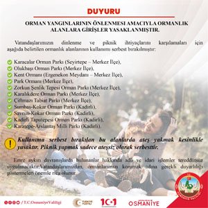 Osmaniye Kent genelindeki ormanlık alanlara girişler ikinci bir duyuruya kadar yasaklandı.